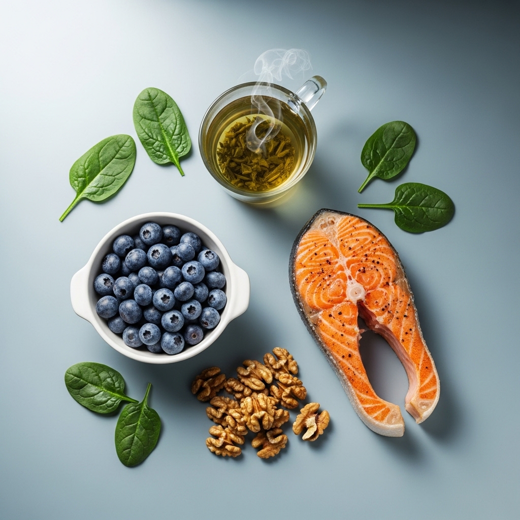 뇌는 활성산소에 취약하며, 이는 인지 기능 저하의 주요 원인 중 하나입니다. 베리류(블루베리, 라즈베리), 다크 초콜릿, 녹차, 강황 등 항산화 물질이 풍부한 식품들은 뇌 세포를 보호하고 염증을 줄여줍니다. 특히 블루베리는 '뇌 강화 슈퍼푸드'로 불릴 만큼 뛰어난 효능을 자랑합니다.