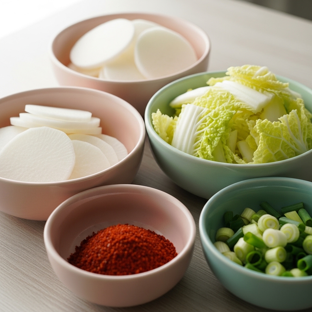 - 배추는 한입 크기로 썰어 소금에 절인 후 물기를 꼭 짜줍니다. 무와 당근은 채 썰고, 쪽파는 송송 썰어 준비합니다.